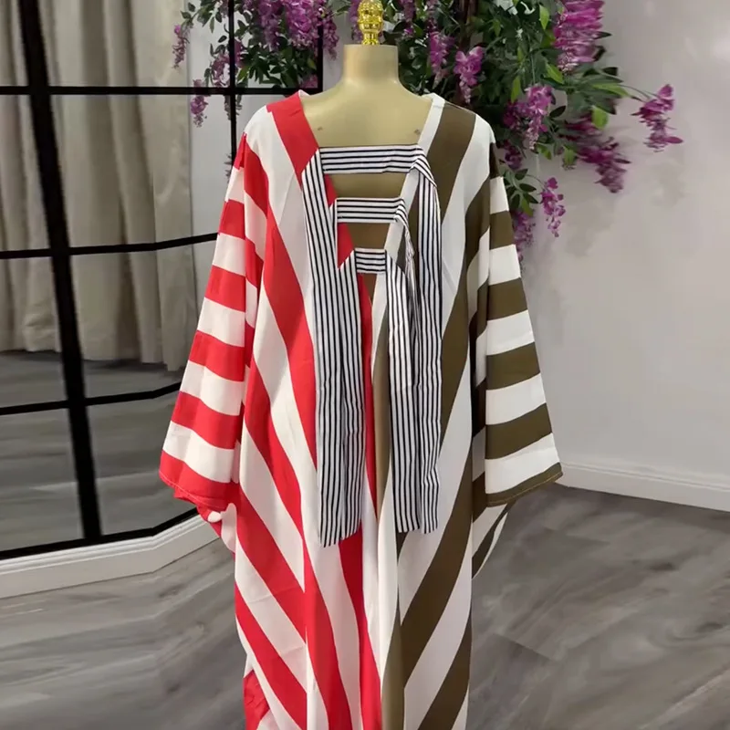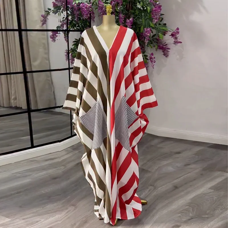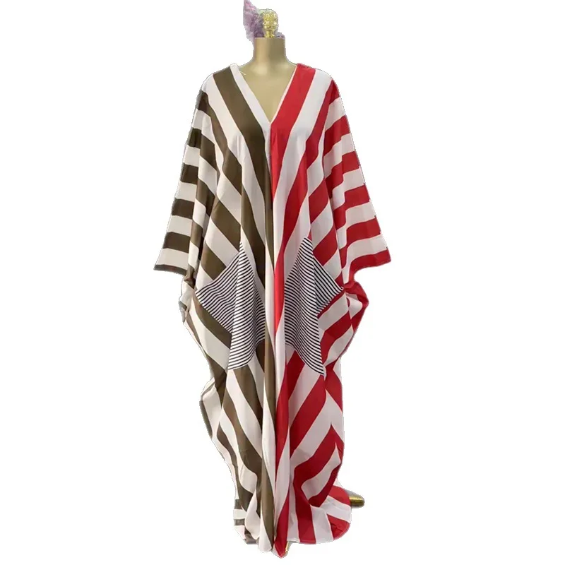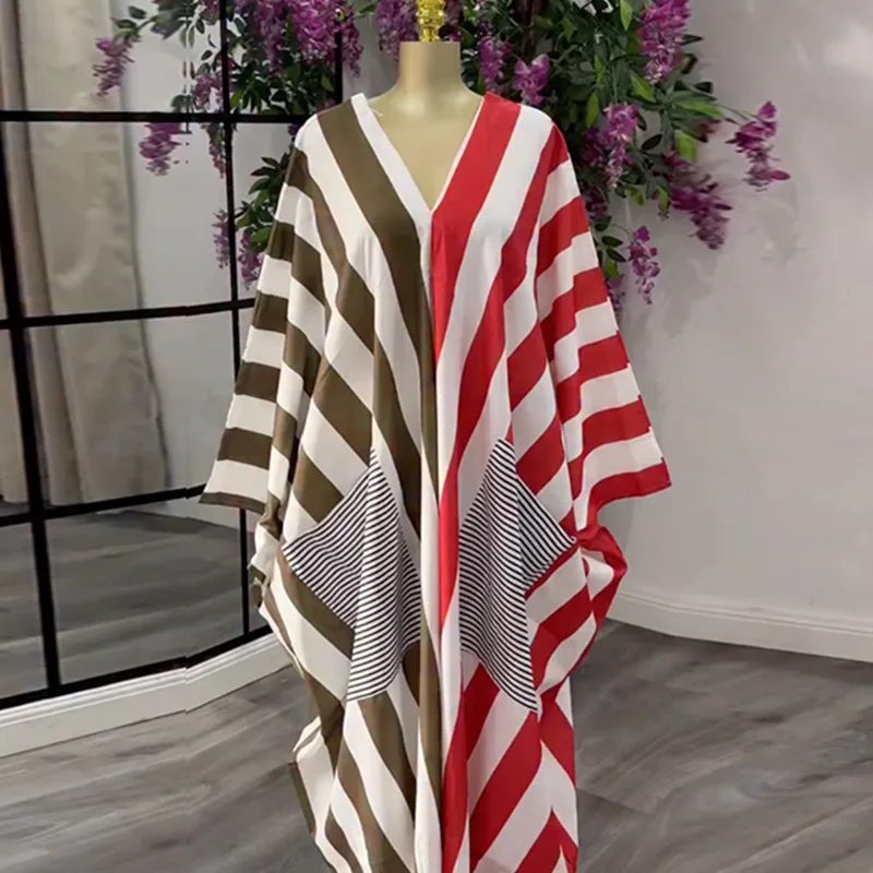 European American Cross-border Women's 2026 Spring New Casual Large Size Loose V-neck Striped Backless Pocket Dress